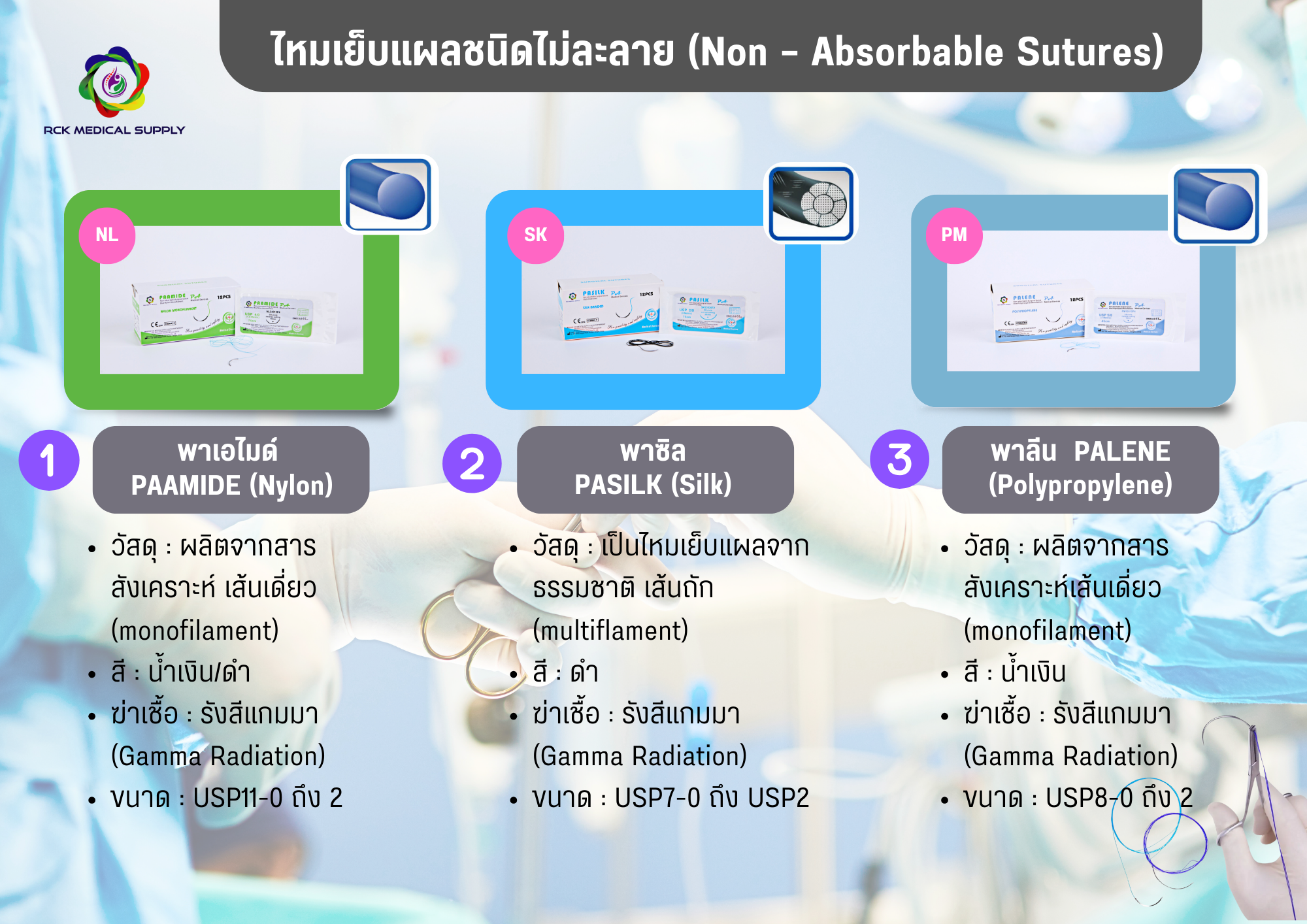 เป็นวัสตุเย็บแผลที่ผลิตจากสารสังเคราะห์เส้นเดี่ยว ชนิดไม่ละลาย มีสีน้ำเงิน แบบมีเข็ม