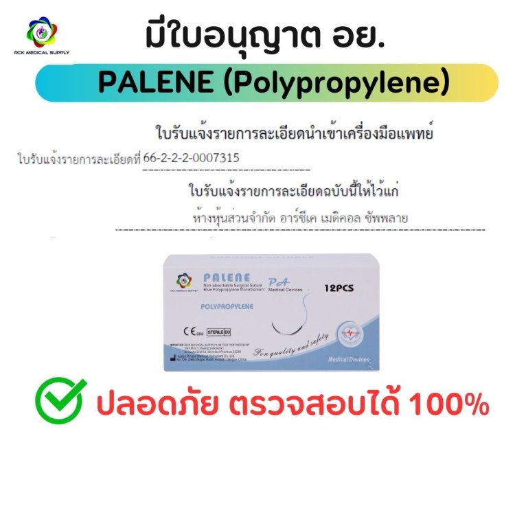 PALENE (Polypropylene) เป็นวัสตุเย็บแผลที่ผลิตจากสารสังเคราะห์เส้นเดี่ยว ชนิดไม่ละลาย มีสีน้ำเงิน แบบเข็มตรง straight