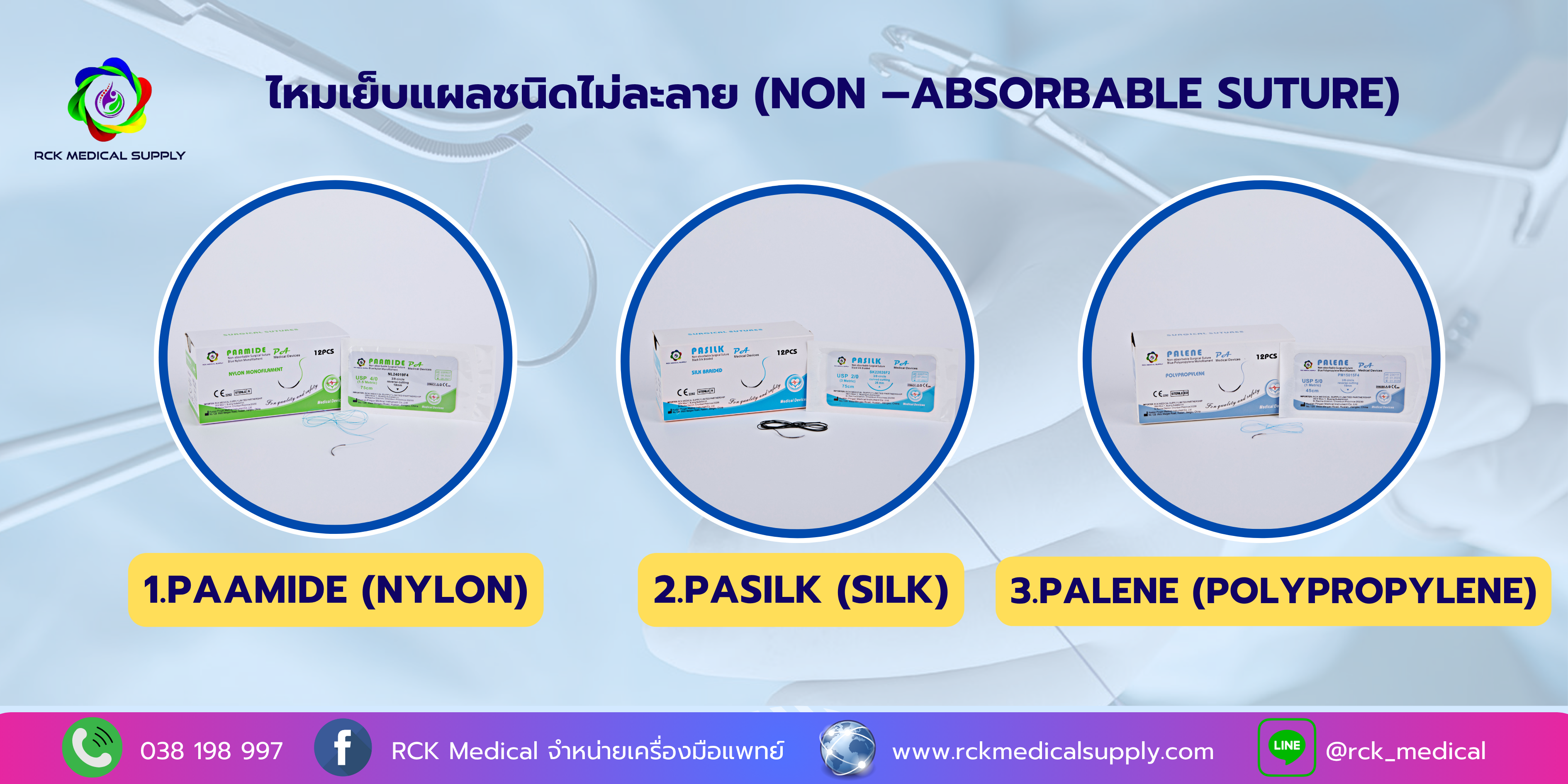 1. PASILK (Silk) : เป็นเส้นใยธรรมชาติที่สามารถจับและผูกได้ง่าย มีความแข็งแรงน้อยที่สุดในไหมไม่ละลาย ไม่นิยมใช้เย็บแผลเล็กๆ