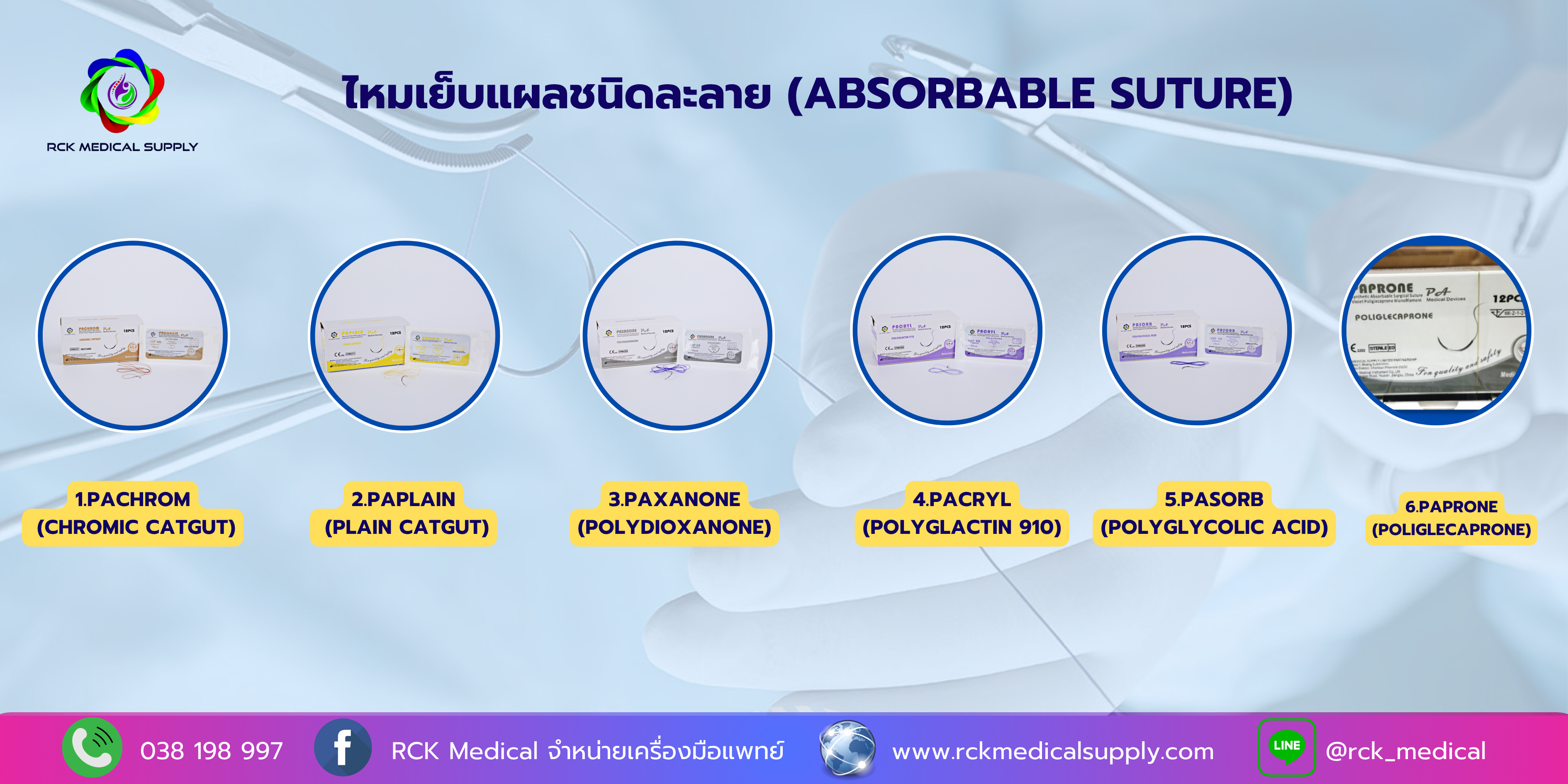2. PACRYL (polyglactin 910) PGLA : มีความแข็งแรงอยู่ได้ 3-4 สัปดาห์ (ละลายได้หมดใน 60-90 วัน)